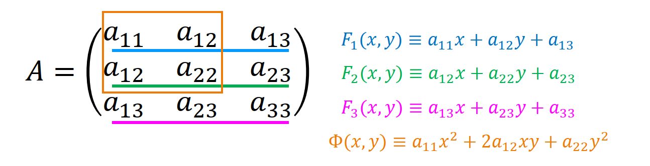 二次曲线的矩阵、$\Phi(x, y)$ 的矩阵:$$A = \begin{bmatrix}a_{11} & a_{12} & a_{13} \\ a_{12} & a_{22} & a_{23} \\ a_{13} & a_{23} & a_{33} \\ \end{bmatrix},\quad A^* = \begin{bmatrix}a_{11} & a_{12} \\ a_{12} & a_{22}\end{bmatrix}$$
