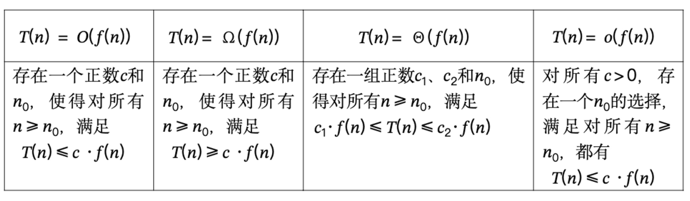 时间复杂度:$T(n) = O(f(n))$,随着 $n$ 的增大,算法执行时间的增长率与 $f(n)$ 相同(这里的定义不严格),指 $\exists C > 0,\ n_0 > 0,\ \forall n \ge n_0,\ 0 \le T(n) \le Cf(n)$.