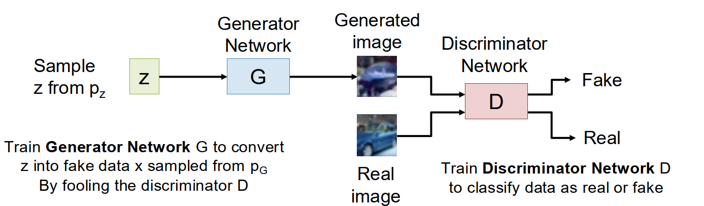 - $G$ tries to fool $D$.