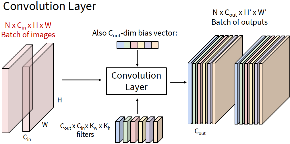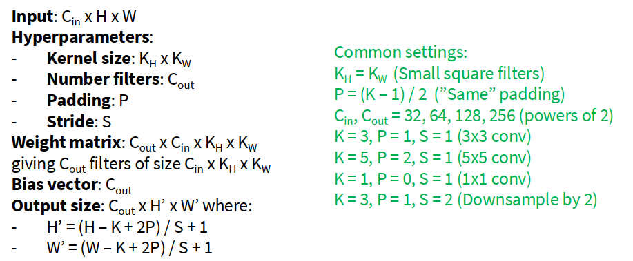 - The output size if $(\text{Input size} - \text{Filter Size} + 2 ·\text{Padding}) / \text{Stride} + 1$. It decreases exponentially so there are not too much conv layers.