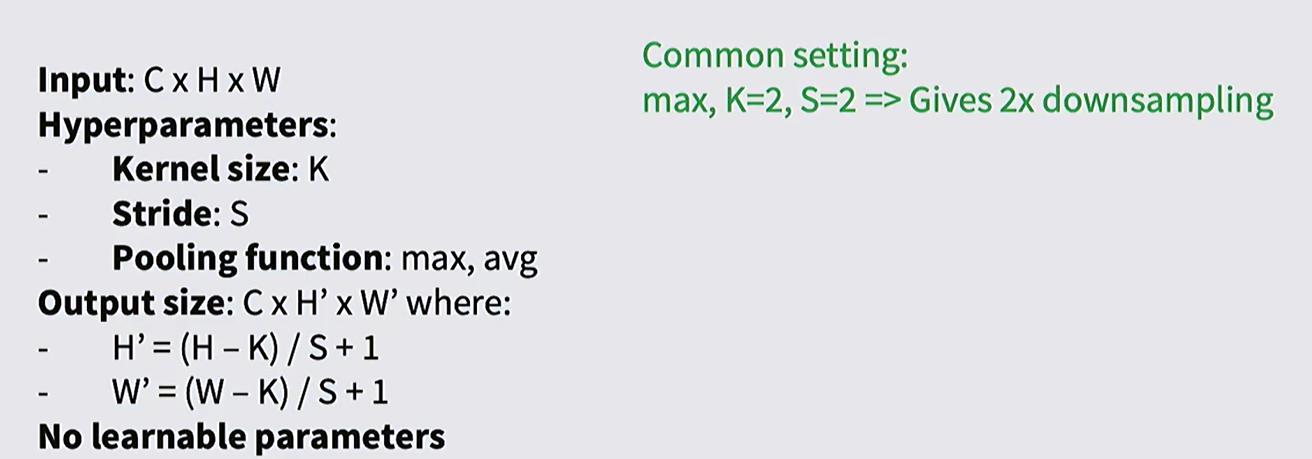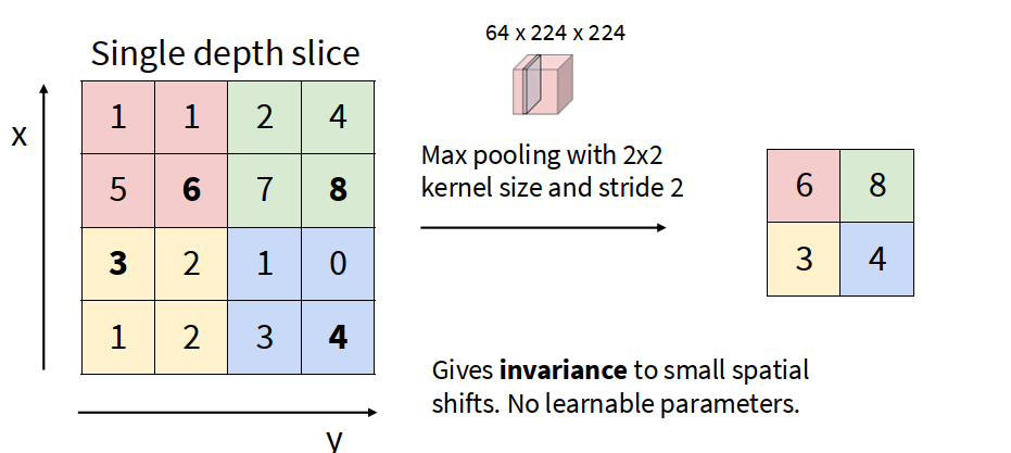 - Max pooling: For each kernel, take the max entry. (Non-linear pooling)