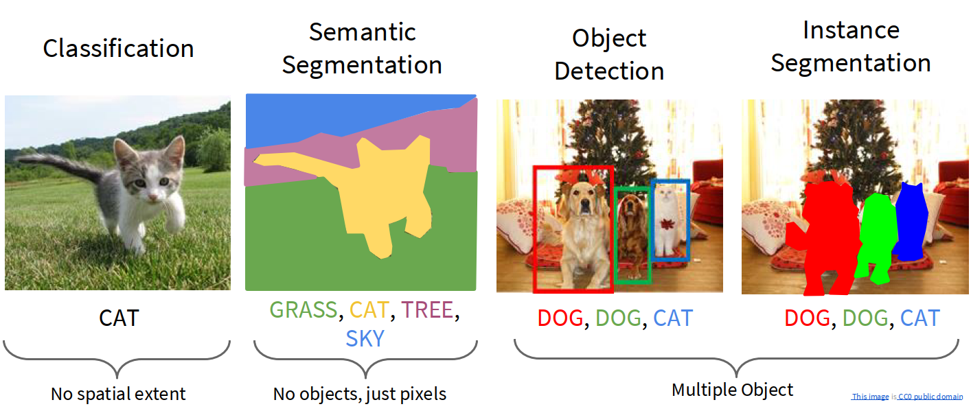- each pixel in the mask is labeled by a semantic category such as grass, sky, cat, tree, road, etc.