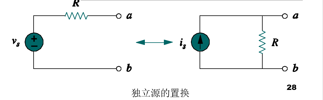 电源转换定理:电压源 $v_s$ 串联电阻 $R$ $\Leftrightarrow$ 电流源 $i_s$ 并联电阻 $R$,其中