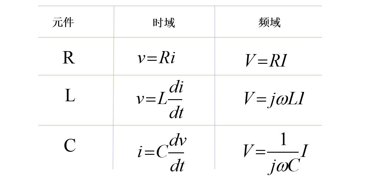 电感 $L$:$\boldsymbol V = j\omega L\boldsymbol I$,对应阻抗为 $Z = j\omega L$