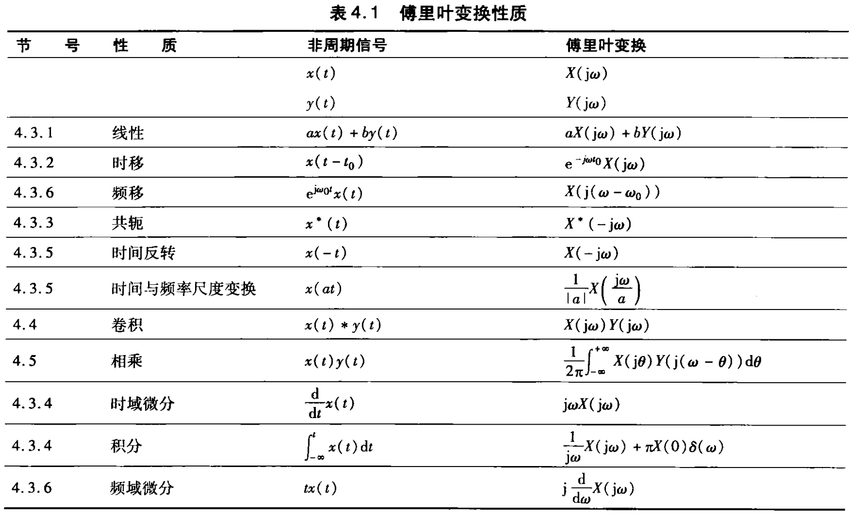 - 频域微分:若 $x(t) \leftrightarrow X(j\omega)$,则 $\displaystyle -jtx(t) \leftrightarrow \frac{\mathrm d X(j\omega)}{\mathrm d\omega}$.