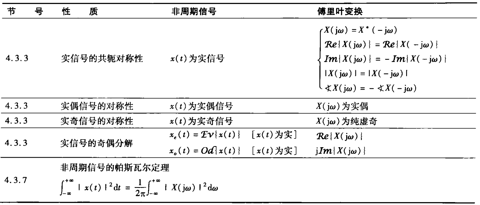 共轭与奇偶性:若 $x(t) \leftrightarrow X(j\omega)$,则 $x^*(t) \leftrightarrow X^*(-j\omega)$