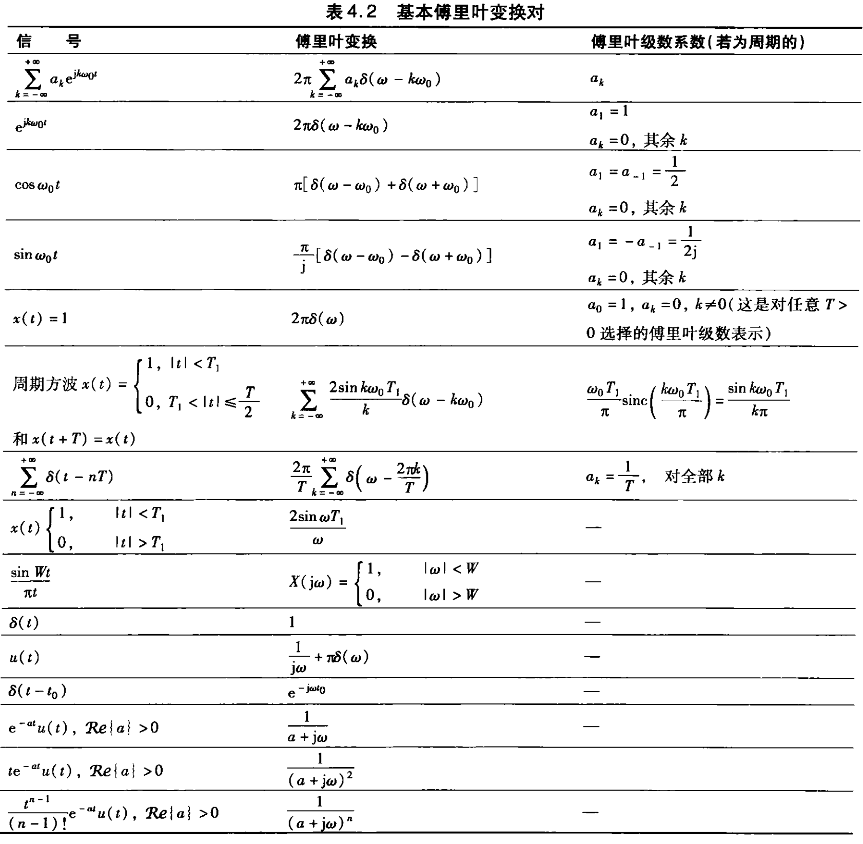 | $\displaystyle x(t) = \sum_{n = -\infty}^{\infty} \delta(t - nT)$ | $\displaystyle X(j\omega) = \frac{2\pi}{T}\sum_{k = -\infty}^{\infty} \delta\left(\omega - \frac{2\pi}{T}k\right)$ | 均匀冲激串 |