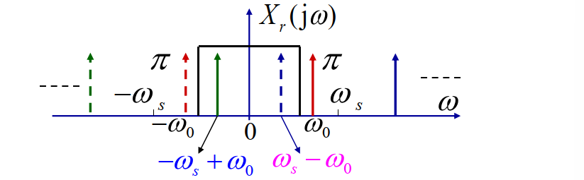 当 $\omega_0 < \omega_s < 2\omega_0$ 时将会产生频谱混叠,恢复的信号的周期将是 $w_s - w_0$.