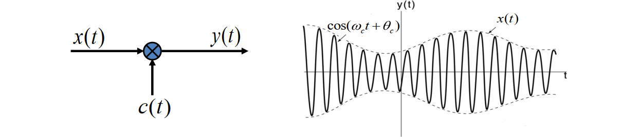 幅度调制的数学模型是乘法器,$y(t) = x(t) · c(t)$,其中 $x(t)$ 是调制信号,$c(t)$ 是载波。调制信号改变了载波的各个位置的幅度,从而已调信号可以保存调制信号的信息。