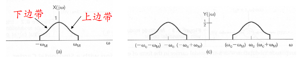 双边带调制:如果令 $c(t) = \cos(\omega_c t)$,那么 $C(j\omega) = \pi [\delta(\omega - \omega_c) + \delta(\omega + \omega_c)]$,是两个冲击,幅度为 $\pi$. 那么已调信号的频谱为 $$Y(j\omega) = \frac{1}{2} [X(j(\omega - \omega_c)) + X(j(\omega + \omega_c))]$$