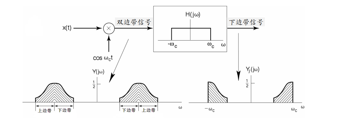 双边带调制信号再经过一个低通滤波器,即可消除一半的边带,减少对频域的占用。