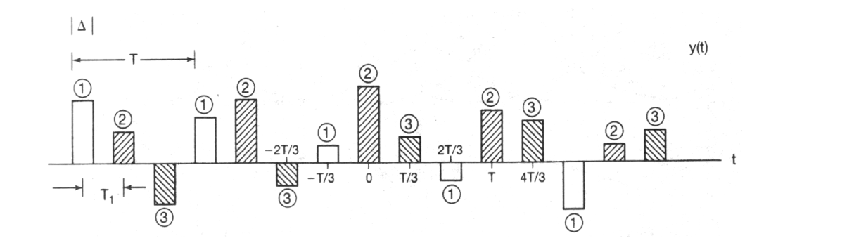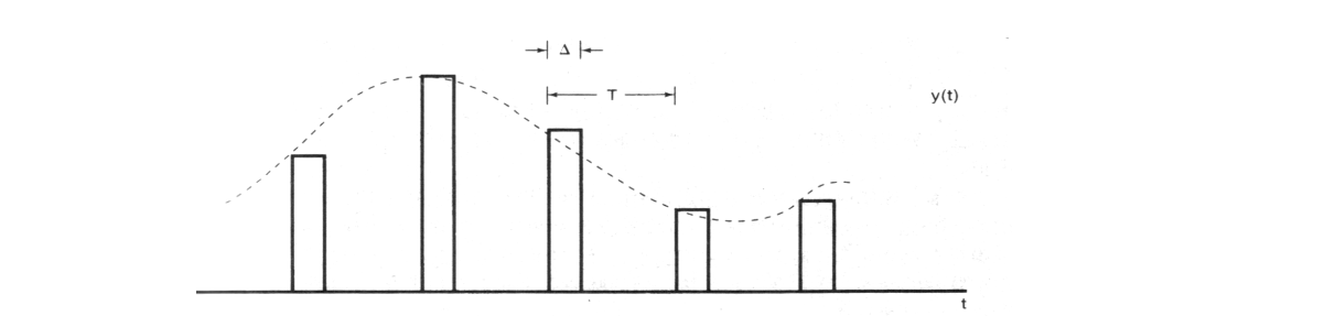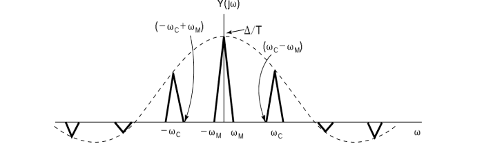 用脉冲串作为载波信号:$$C(j\omega) = 2\pi \sum_{k = -\infty}^{\infty} a_k \delta(\omega - \frac{2\pi}{T}k)$$ 那么已调信号为 $$Y(j\omega) = \sum_{k = -\infty}^{\infty} a_k X[j(\omega - \frac{2\pi}{T}k)]$$ 信号可恢复要求 $\displaystyle 2\omega_M < \frac{2\pi}{T}$.