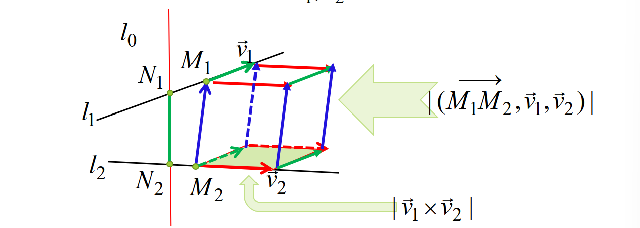 异面直线距离公式:$\displaystyle d = \frac{\left|\overrightarrow{M_1M_2} · (\boldsymbol v_1 \times \boldsymbol v_2)\right|}{\left|\boldsymbol v_1 \times \boldsymbol v_2\right|} = \frac{\left|(\overrightarrow{M_1M_2}, \boldsymbol v_1, \boldsymbol v_2)\right|}{\left|\boldsymbol v_1 \times \boldsymbol v_2\right|}$