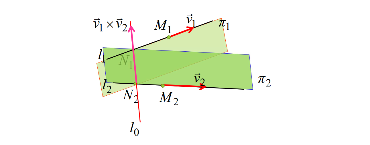 公垂线方程:对于 $M_1$ 与向量 $\boldsymbol v_1, \boldsymbol v_1 \times \boldsymbol v_2$ 生成的平面 $\pi_1$ 和 $M_2$ 与向量 $\boldsymbol v_2, \boldsymbol v_1 \times \boldsymbol v_2$ 生成的平面 $\pi_2$ ,他们的交线就是公垂线。