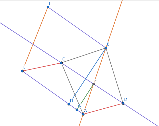 我们要计算 $AB,CD$ 的交点 $F$ 的具体坐标。此时我们作平行四边形 $ADCE$,平行四边形 $ABIE$,$F$ 为 $AB,CD$ 交点。并作 $AE$ 分别过 $B,F$ 的高 $BH,FG$.