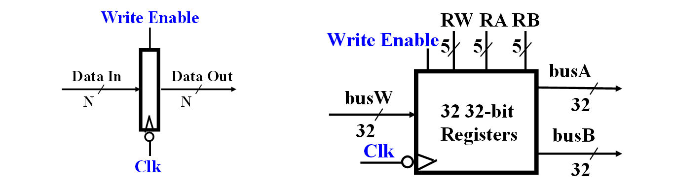 - 组合逻辑读出:busA, busB 立即取出读入地址 RA, RB 对应的数据(无需在时钟前稳定一段时间),经过一个取数时间 (Access Time) 后才有效(组合逻辑立即完成的)。用两个32 位 MUX 来实现。