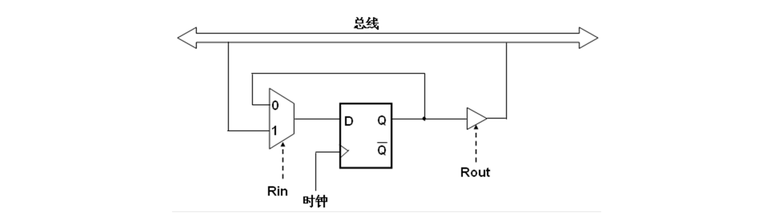 Rin控制多路选择器:若为1则将总线数据送到 D 触发器,否则将Q原样送到 D 保持器,即保持。Rout控制三态门:若为1则打开,将 D 触发器的输出送到主线,否则断开。- 时钟控制同步更新