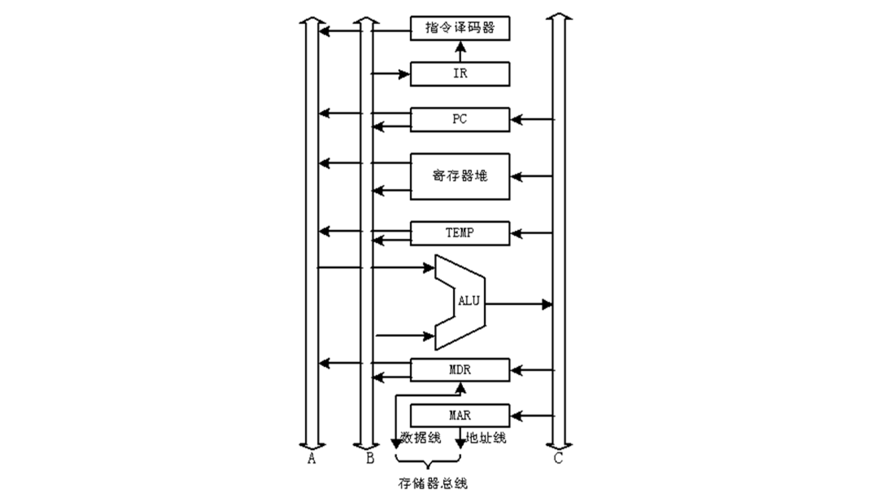 | C 总线 | 传送运算结果 | 从 ALU 输出 → 寄存器堆、存储器等 |