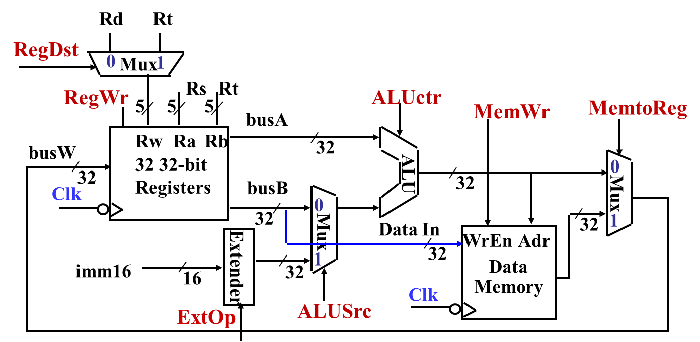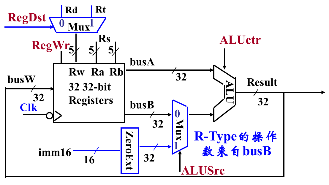 | ALUSrc | ALU Source | 选择 ALU 的第二个输入:0 → busB,1 → 立即数 | 1 |