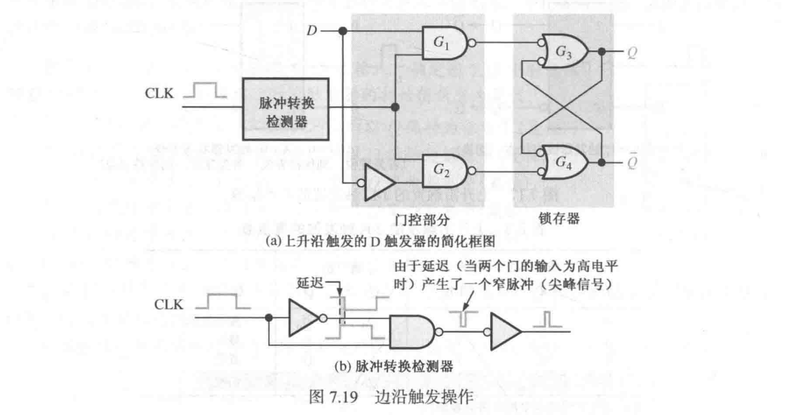 - 边沿触发操作:将时钟信号传送到脉冲转换检测器,利用门电路的延迟 $Y = A · \overline{A}$ 产生一个窄脉冲(尖峰信号)