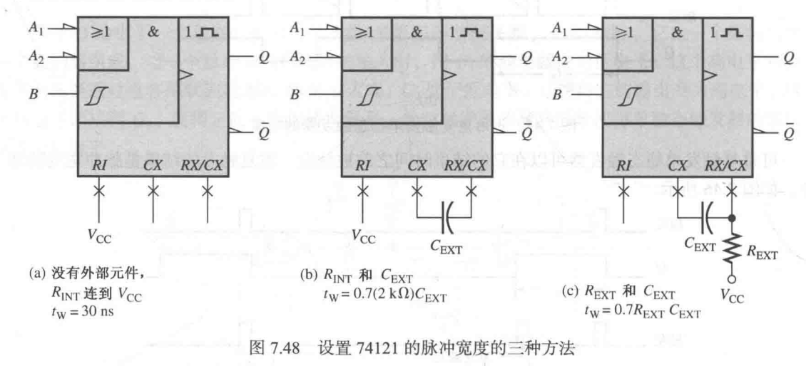 - 设置脉冲宽度:$$t_w = 0.32 RC_{EXT} \left(1 + \frac{0.7}{R}\right)$$