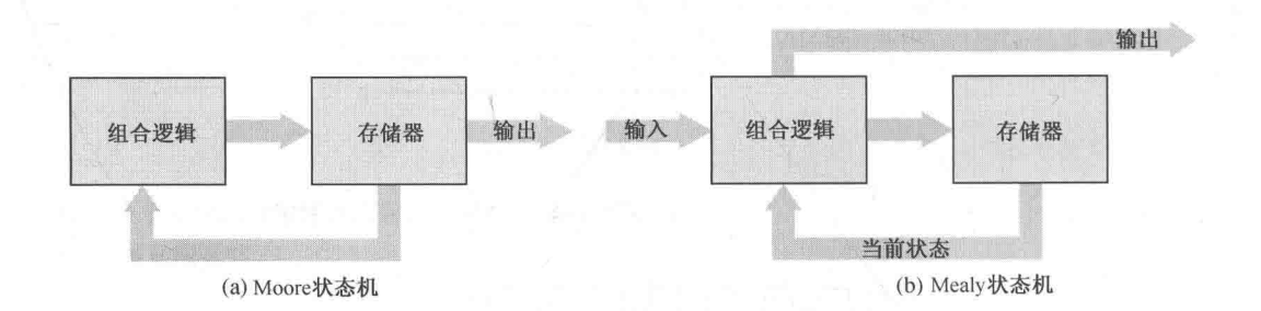 - Mealy 状态机:由输入、组合逻辑、存储器、输出组成。组合逻辑既依赖于当前存储器的状态,也依赖于输入。