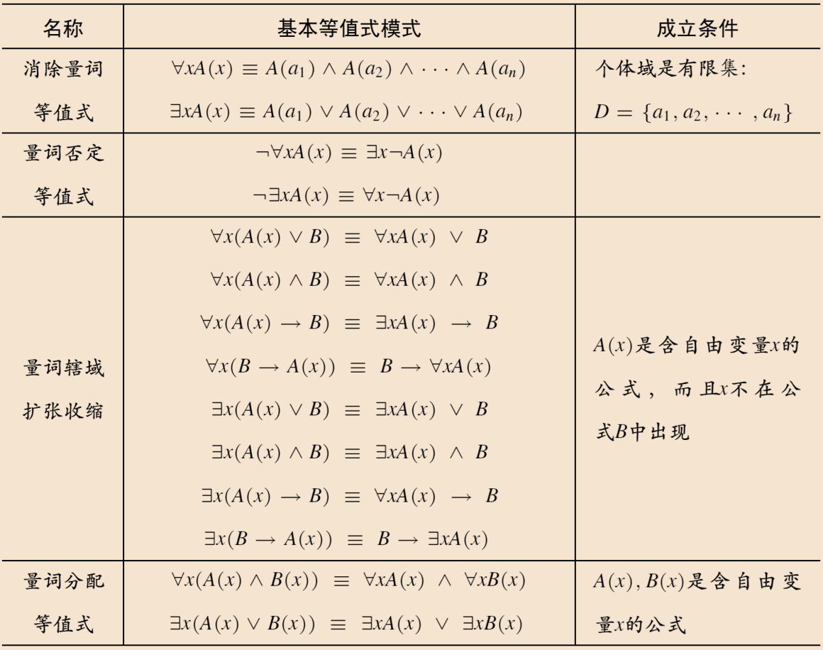 逻辑等值:两个一阶逻辑公式在任意解释和任意个体变量指派函数的真值都相同。