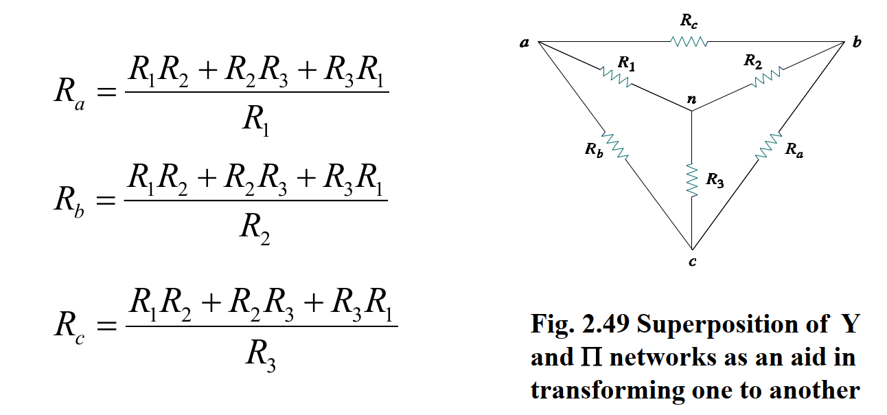 $\mathbf{Y \to \Delta}$ 变换公式: $\Delta$ 每条边的等效电阻等于 $Y$ 中电阻两两乘积除以对边电阻