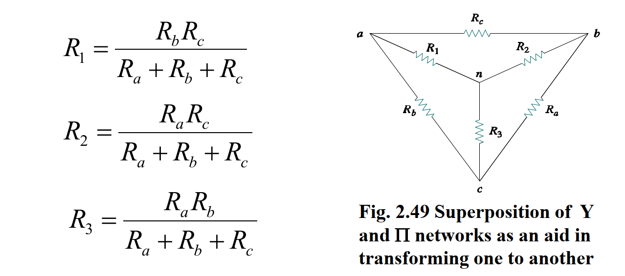 $\mathbf{\Delta \to Y}$ 变换公式: $Y$ 的每个等效电阻等于 $\Delta$ 中邻边电阻乘积除以电阻总和