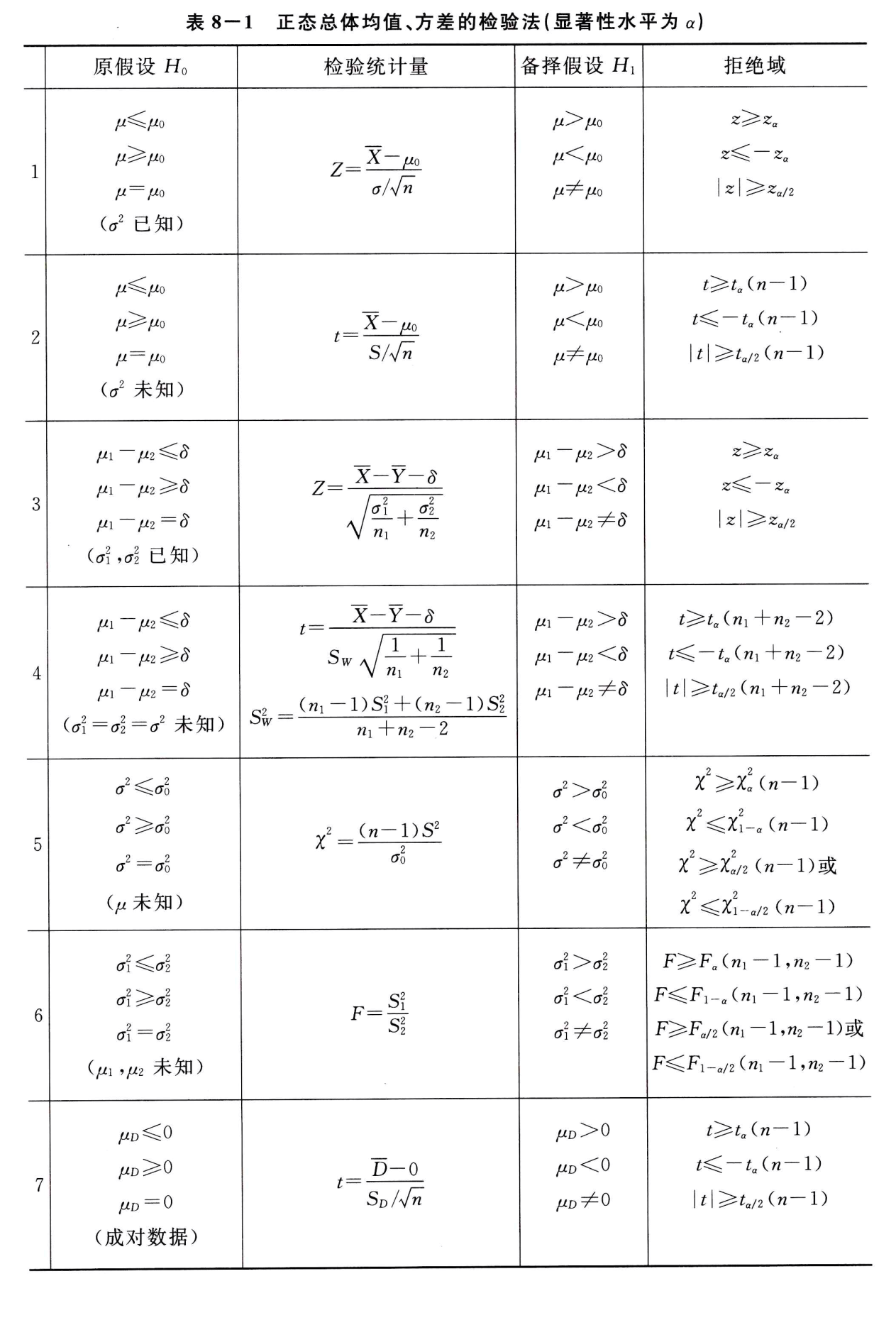 | $\displaystyle \mu$ | $\displaystyle \sigma^2$ 未知 | $\overline{X}$ | $\displaystyle t=\frac{\overline{X}-\mu}{S/\sqrt{n}}\sim t(n-1)$ | $\displaystyle \left( \overline{X}\pm \frac{S}{\sqrt{n}} t_{\alpha/2}(n-1) \right)$ | |