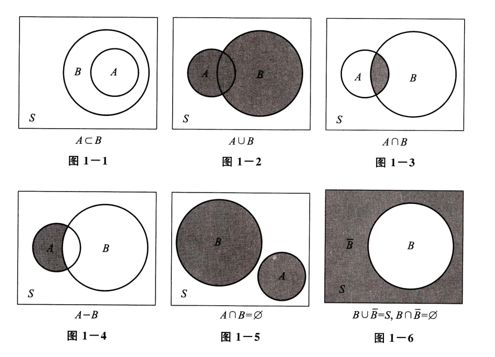 包含 $A\subset B$、和事件 $A\cup B$、积事件 $A\cap B$