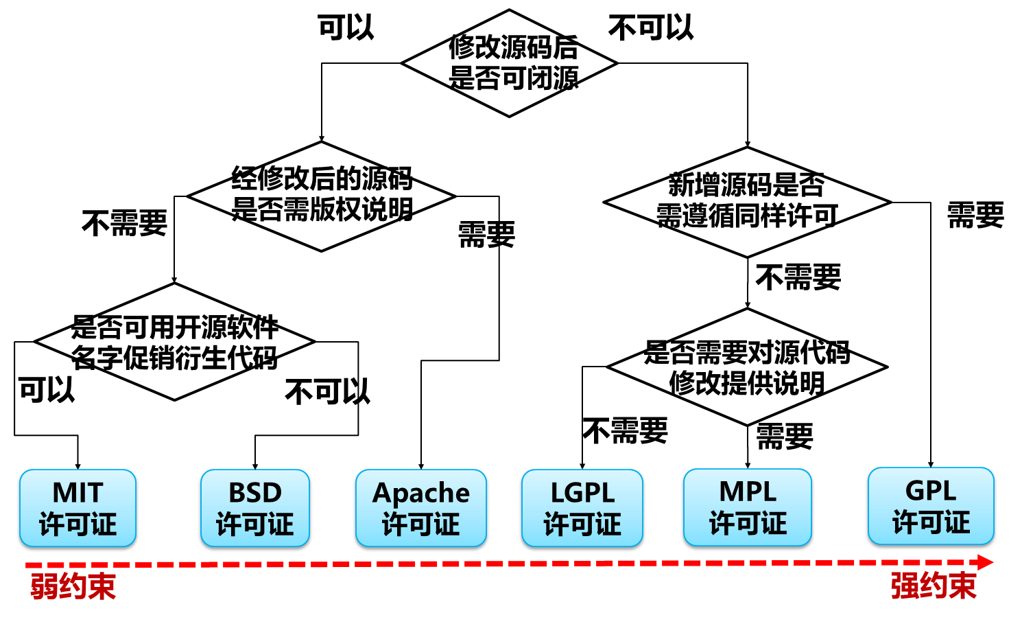 开源许可证:声明获得开源代码后拥有的权利,界定对别人的开源作品进行何种操作、何种操作是被禁止的,规范开源软件的使用要求和约束